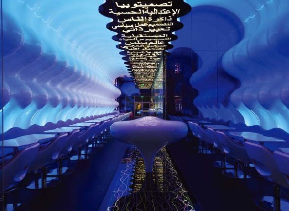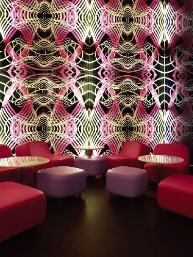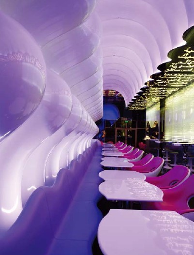 阿拉伯勵(lì)志諺語(yǔ)作為吊頂裝飾圖案,以背光方式顯示出來(lái),極具特色。波浪狀座椅與起伏的墻面渾然一體,營(yíng)造出活力動(dòng)感的氛圍。起伏的墻板和玻璃、鉻合金材料的大量應(yīng)用使會(huì)所的光滑亮澤感倍增,明亮閃耀的飾面將墻上巨大的流行圖案、卷曲的文字、光滑的聯(lián)排座椅和休閑區(qū)貫串為一體。極簡(jiǎn)、單純的色彩方案完美地襯托出不斷變換色彩的墻壁。一天之中,會(huì)所的“顏色”在粉、紫、藍(lán)、綠、黃、紅等顏色之間自由變換,粉、紫色調(diào)則體現(xiàn)在家具和數(shù)碼藝術(shù)作品上。