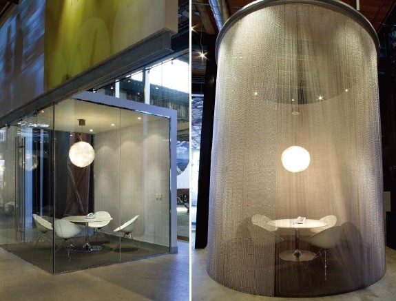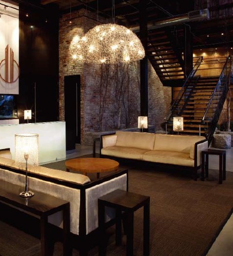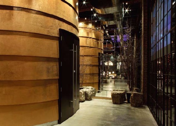 拋光金屬臺(tái)燈上裝飾的珠簾燈罩是設(shè)計(jì)中的精彩亮點(diǎn)。這些精致私人會(huì)所設(shè)計(jì)格調(diào)的家具和配飾與建筑原有的鐵梁、立柱和混凝土地面等基礎(chǔ)構(gòu)造形成強(qiáng)烈對(duì)比。新隔間墻壁的飾面設(shè)計(jì)仿照舊石磚上的紋理,經(jīng)涂抹和銹漬處理制成。這樣的室內(nèi)景觀使人們聯(lián)想到古老的海濱森林。