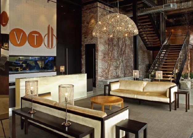 鏡面墻東側(cè)是一個(gè)巨大的罐狀結(jié)構(gòu),結(jié)構(gòu)的外側(cè)被銅質(zhì)葉片包裹。建筑內(nèi)部設(shè)計(jì)十分簡(jiǎn)潔,從而使視頻演示墻更能吸引人們的目光。當(dāng)演示結(jié)束時(shí),墻壁會(huì)自動(dòng)移開(kāi),一條明亮的激光束引導(dǎo)準(zhǔn)購(gòu)房者走向設(shè)計(jì)驚人的樓盤(pán)模型。周?chē)鷫Ρ谏系膱D形代表“昨天和今天”這一主題,形象地詮釋了Liberty Village社區(qū)的創(chuàng)新和該地區(qū)悠久的歷史。