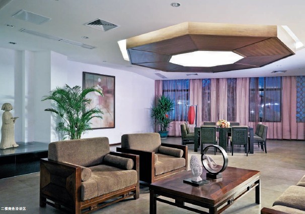 整個會所裝飾設計形式上多處運用古典木質格窗,材料上多選用木材,空間顯得內斂含蓄。大堂與會客區(qū)之間動線流暢,體現(xiàn)著商業(yè)空間的開放、流動、多元化。個性木質造型頂棚、燈光、鏤空格窗等在建筑中創(chuàng)造出更為廣闊大氣的商業(yè)空間;置身其中,業(yè)主可以體驗到的不僅是建造所花費的巨大物質財富,更是一筆在無形中倍增的精神財富。