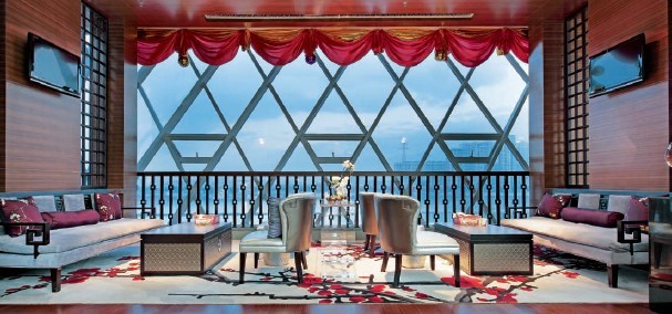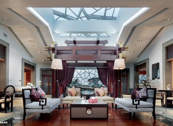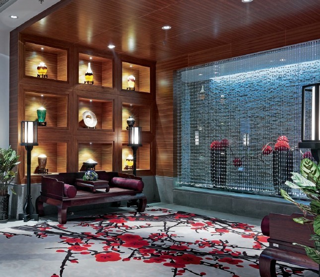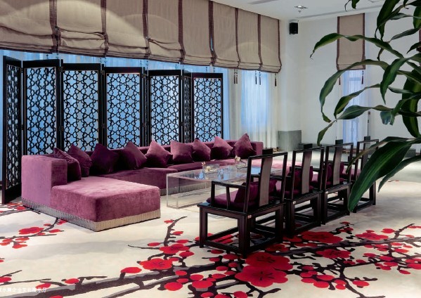 本會所共分四層,一層主要為展示及休閑洽談區(qū),并配有中式建筑風(fēng)格的室內(nèi)游泳池;二、三層為會所的多功能區(qū)域;四層主要將樓盤模型展示區(qū)與多功能休閑區(qū)相結(jié)合。在陳設(shè)搭配上,以梅花為商務(wù)會所設(shè)計(jì)元素貫穿整個(gè)空間,如地毯、紙巾盒、抱枕等,結(jié)合中式傳統(tǒng)的鳥籠、藝術(shù)品、落地?zé)?、對稱的家私擺放等展現(xiàn)出東方的神韻與魅力。