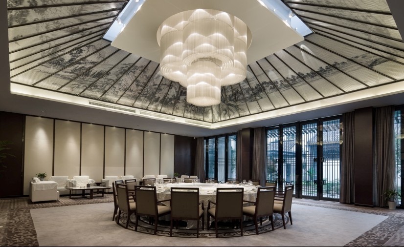 通過曲橋、連廊、庭院有機(jī)地將這些分散的獨(dú)立空間銜接起來,整體錯落有致、層次分明。項目共有豪華包廂20個、大小會見廳2個,大型會議室1個、就餐大廳1個,空間特色分明,裝飾風(fēng)格尊貴大氣。