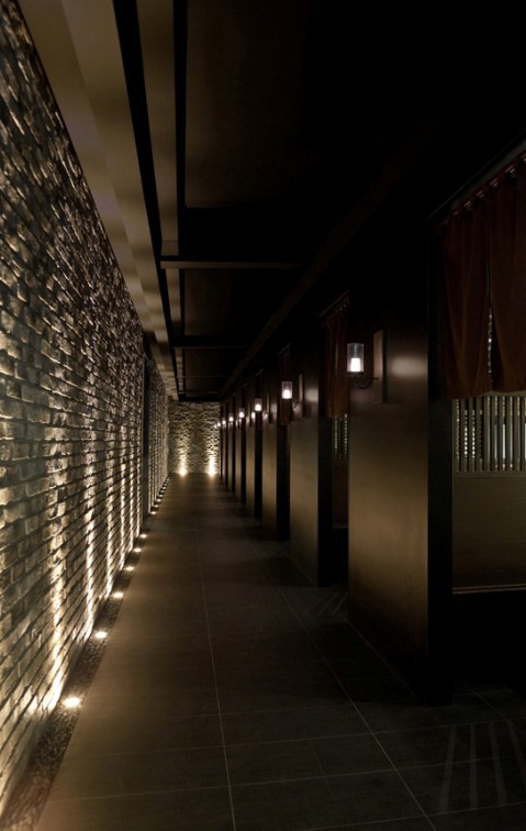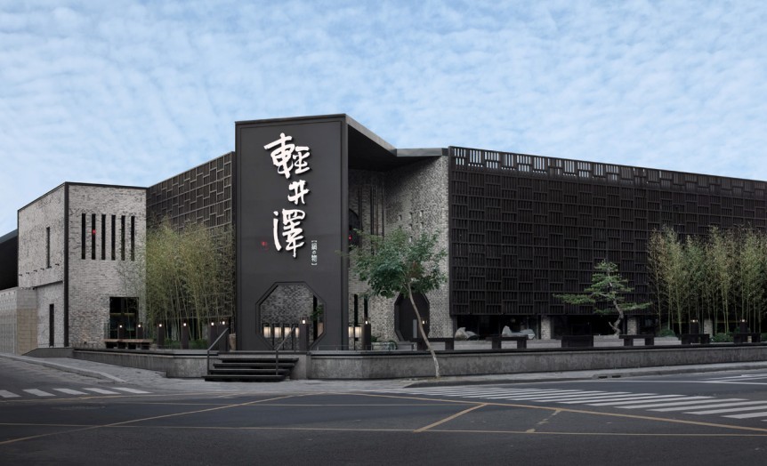 靜定穩(wěn)重的建筑主體采用古色古香的斑駁灰磚砌作,兩側(cè)立面分別裝置大小交錯(cuò)銜接的黑色格柵以及纖長(zhǎng)的直列開窗,融入簡(jiǎn)化后的格柵線條。低調(diào)的禪風(fēng)加上現(xiàn)代感的會(huì)所設(shè)計(jì)技巧繪景,使建筑兼具水墨與和風(fēng)的美感,散發(fā)醇香的人文風(fēng)味。