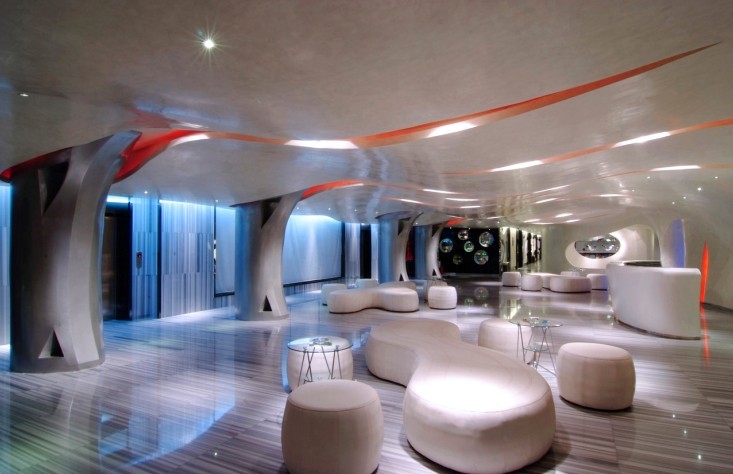 會(huì)所的入口蔓延武漢的城市記憶,利用紅色打造出一片片曲版,表達(dá)出韻律化形變的空間,而鏡面與液晶畫面的搭配,擴(kuò)大了空間感,影音的效果也被擴(kuò)大。視覺的想象在大廳內(nèi)被激蕩,音符劃過天際轉(zhuǎn)換成五彩幻化的光景,燃燒的音浪讓地面上象征黑白琴鍵的石材瞬間被彈奏起來。在超現(xiàn)實(shí)的空白空間內(nèi),自在隨意擺放的白色卵石沙發(fā),起著穩(wěn)定空間的力量,讓人在此等候也變得輕松愉悅。