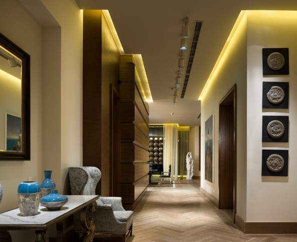 您現(xiàn)在所在的位置:首頁>設(shè)計(jì)風(fēng)向標(biāo)>正文 室內(nèi)色調(diào)摒棄了鮮明的冷暖感受和彰顯個(gè)性的純色應(yīng)用,而主要采用中性色調(diào),期間穿插運(yùn)用了駝色、金色、銀灰、 深褐色、營造出高端、典雅和奢華的視覺效果。同時(shí)在裝飾圖案方面,設(shè)計(jì)在多處運(yùn)用了具有中國古典特色的大紅與金黃。天花、地毯、墻面裝飾、甚至是沙發(fā)靠墊都相互呼應(yīng)、相互襯托,為空間氛圍的營造提供品質(zhì)的體現(xiàn)。