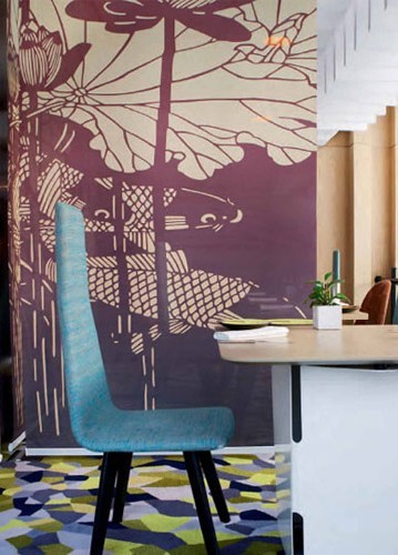 中國風(fēng)與波普,如此相隔甚遠的風(fēng)格卻依然能兼容。中式元素與波普分地毯韻味十足。選擇頗具波普風(fēng)的地毯與充滿中國風(fēng)情的花卉壁紙相映成趣;海報形式的中國場景壁紙,配以艷麗的色彩、甚至獨具中國特色的自行車作為家居配飾……在波普圖案的襯托下,整個空間有一種生動的感覺。