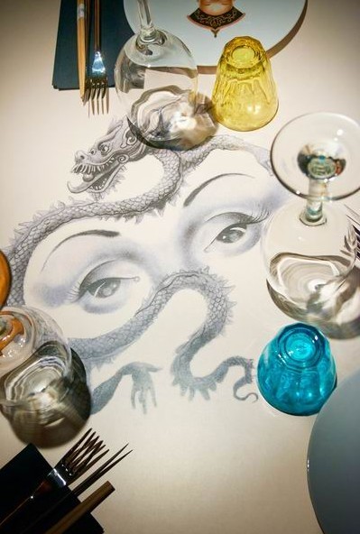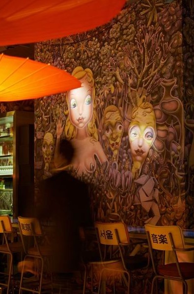 在整個餐飲會所設(shè)計中設(shè)計師運(yùn)用一些夸張的元素作為主要材料:巨大的吧臺、David Rochline繪制的壯觀的壁畫、碩大無比的茶壺吊燈,這些看似隨意的拼湊給人一種自由的舒適感,雖然Miss Kō位于巴黎但亞洲韻味也十足,色調(diào)上被不亮麗,灰色與彩色的碰撞給更顯得一絲絲神秘而陰郁。