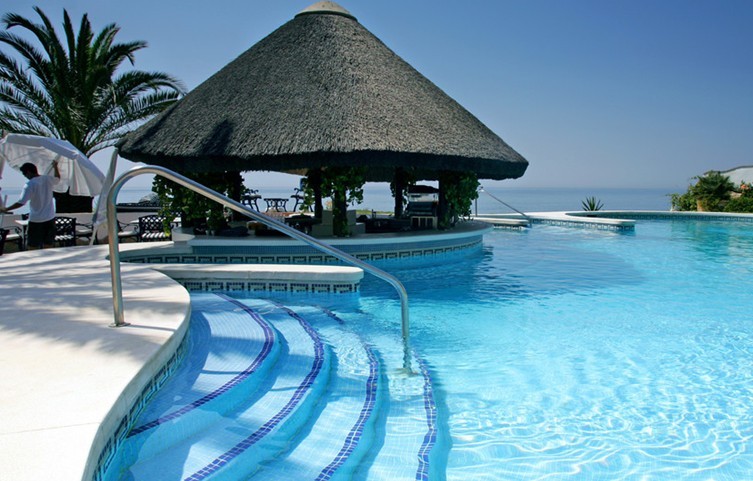 泳池為混凝土結(jié)構(gòu),水線與泳池頂部下邊緣之間帶有瓷磚裝飾,泳池的淺水區(qū)要設(shè)有帶扶手梯,在深水區(qū)設(shè)有鍍珞不銹鋼的踏板階梯。