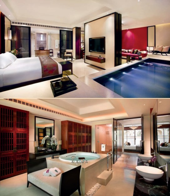 酒店設(shè)有246套套房和別墅,所有套房及別墅的設(shè)計(jì)均富有東方特色。設(shè)計(jì)層高都很高且室內(nèi)裝飾華麗,房間以象征吉祥的朱紅色來點(diǎn)綴。