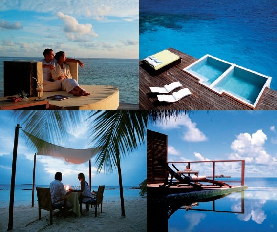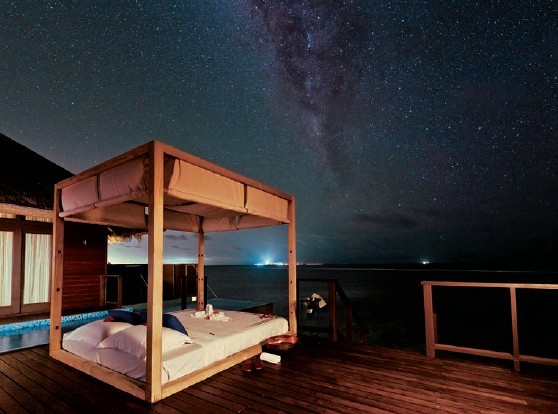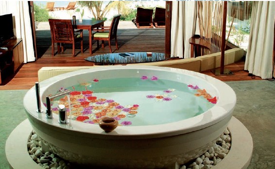 每一個別墅都有寬敞的浴室、特制裝置和豪華設(shè)施。島上的豪華別墅提供一個大型的開放式空間、寬敞的臥室、成套的更衣室、在中心浴缸能俯瞰大海的現(xiàn)代浴室和兩個淋浴室(室內(nèi)和室外)。在室外,別墅擁有一個泳池、沙發(fā)床、休閑區(qū)、私人日光浴場和用餐的私人庭院。海上別墅提供一張?zhí)卮筇柎?、寬敞的室?nèi)、室外淋浴、雙洗手盆和大浴缸??蛷d面朝帶有室外座位和泳池的私人陽臺,分離的日光浴甲板,及直接進(jìn)入壯觀瀉湖的通道。海上頂級別墅設(shè)有一張?zhí)卮筇柎埠蛯挸ǖ脑∈?,一個特別設(shè)計的浴缸、淋浴和雙洗臉盆。寬敞的室外甲板是休閑、日光浴、用餐或在大型私人泳池游泳的最佳場所。