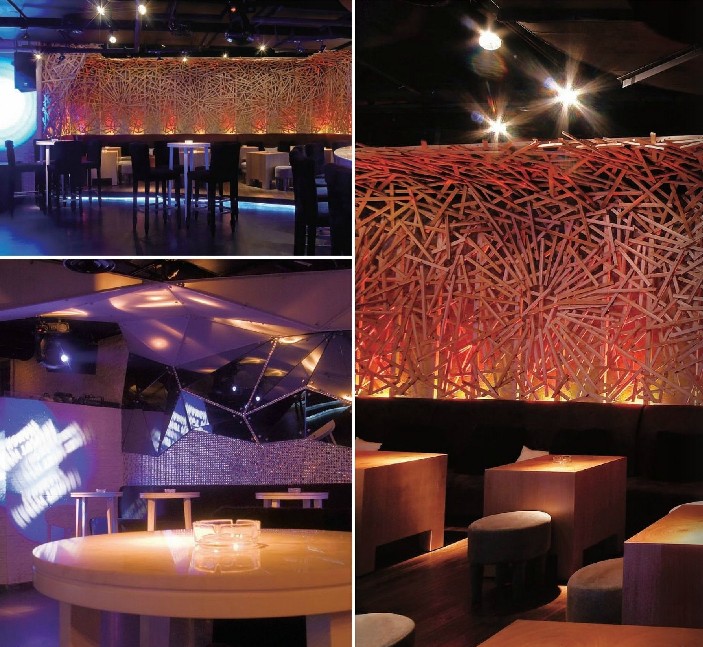 Aurora酒吧主要分為兩個部分:主要部分為正對入口的大廳。大廳兩邊有各自獨立的包間,每個包間可以容納12個人。進門右側(cè)的包間以天然原木搭建而成,就像北歐冰天雪地里打獵的獵刀門休憩的木屋;左側(cè)的包間是圓形拱頂,用嵌有白色晶片的閃亮大理石砌成的小屋子,營造了冰雪的感覺。