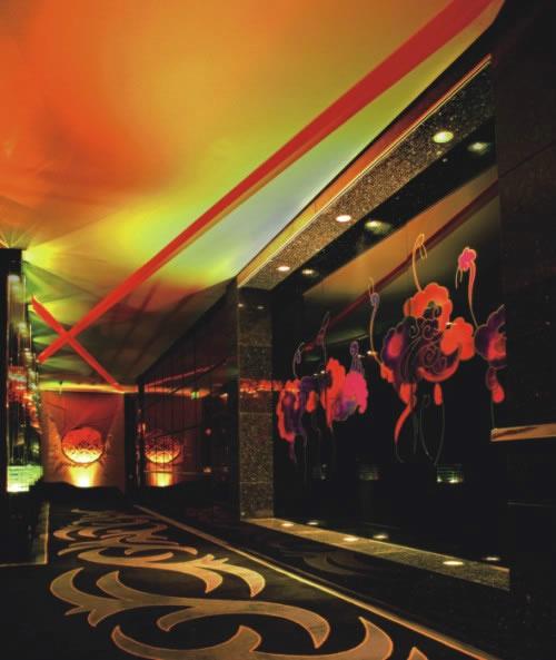 夜總會位于商務(wù)客房樓的二三四層,每層的定位很明確,二層迷離斑斕,大量使用金屬、玻璃、鏡面以及七彩幻變的LED光源塑造奇幻迷離的視覺效果。三層神秘瑰魅,借助經(jīng)過特殊訂制的雕塑、琉璃裝置來講述一個個神秘撩人的故事。四層夜總會設(shè)計高貴奢華,則通過黑色水晶、黑色真皮、七彩光纖營造高貴奢華的氛圍。“紅”色主題不斷出現(xiàn)在各個區(qū)域,以不同的姿態(tài)。不同的特質(zhì)盡情宣泄若燃燒的欲望,設(shè)計師希望通過各種不同類型的材料,紛繁復(fù)雜的工藝來挑戰(zhàn)自己的駕馭能力。