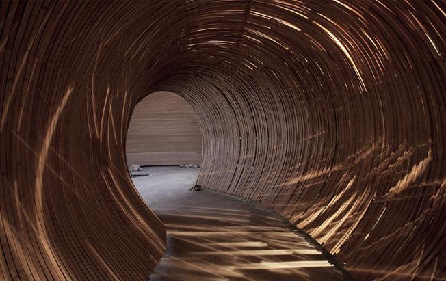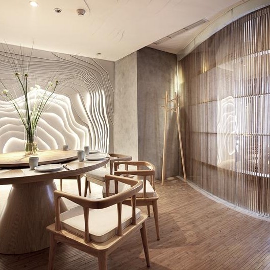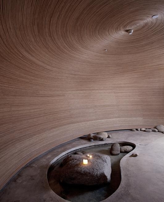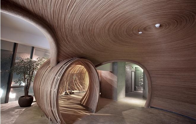 走進(jìn)樸素養(yǎng)生洗浴會(huì)所,迎面而來(lái)的并非傳統(tǒng)一目了然的玄關(guān)以及桌椅,竹條編織的弧形空間,光影透過(guò)縫隙,有種親臨自然的錯(cuò)覺(jué)。天花并沒(méi)有花樣,弧形的空間就是一個(gè)過(guò)渡,前往的顧客需要一種心情的過(guò)濾通過(guò)起伏蜿蜒的隧道,到豁然開(kāi)朗的穹頂:從臨窗見(jiàn)江的開(kāi)放明亮,到竹柵圍合的私密幽暗。