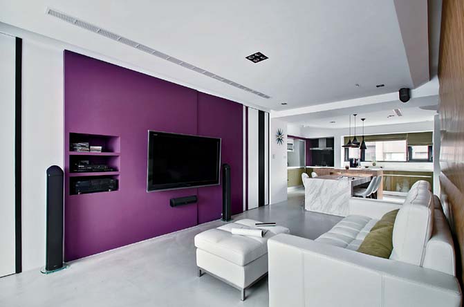 入口獨(dú)立玄關(guān)區(qū)由于容納鞋柜與安置腳踏車(chē)的必要性,搭配兼做客廳電視墻的隔間與拉門(mén)來(lái)界定。視線(xiàn)進(jìn)入開(kāi)放規(guī)劃的公共空間,活潑且大膽的色彩搭配,成了寵愛(ài)視覺(jué)的第一印象,首先是客廳以?xún)?yōu)雅蘭花發(fā)想的紫紅色主墻,配合分段立體層次,以及紫、白、黑三色不規(guī)則的直行分割比例,巧妙將玄關(guān)拉門(mén)和主墻左側(cè)的儲(chǔ)藏室入口隱藏其間,建構(gòu)活潑且富于律動(dòng)節(jié)奏的連續(xù)面造型,壁掛電視旁?xún)?nèi)縮的機(jī)柜設(shè)計(jì)借用后方玄關(guān)空間,取代傳統(tǒng)視聽(tīng)柜占據(jù)空間。
