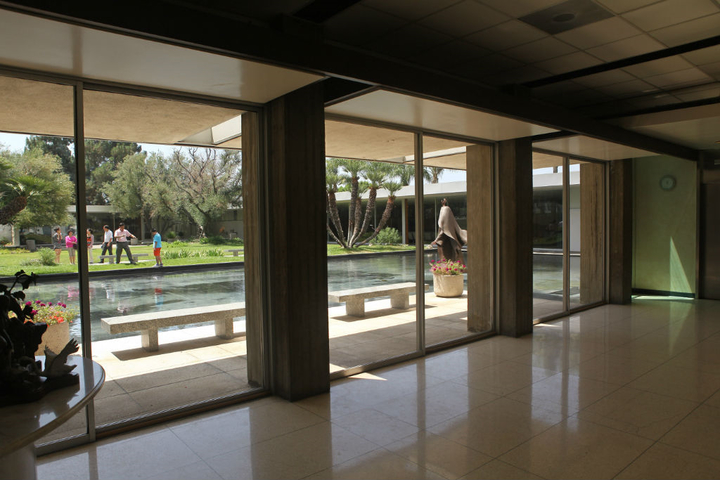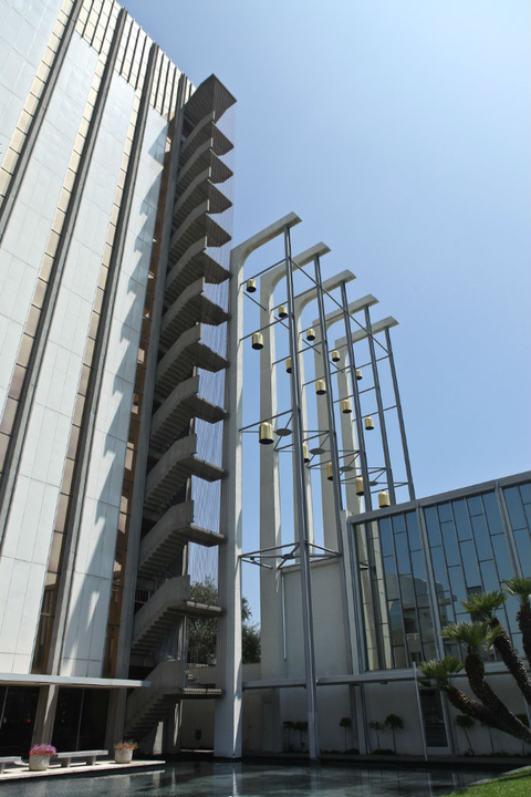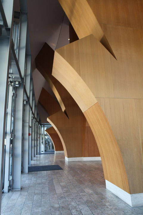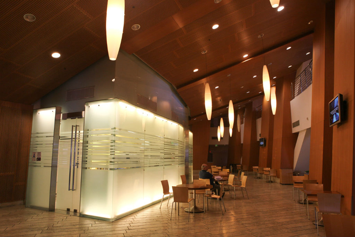 酒店大廳設計,簡約的暖色柱狀設計為整個生冷的空間注入一絲暖意
