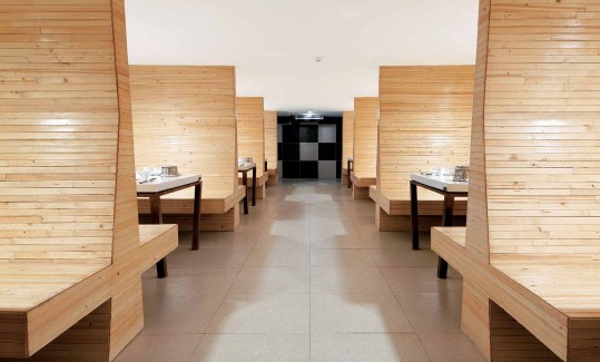 與斑馬皮紋座椅相對的是高木背椅的設計,高木背椅設計是考慮到了就就餐顧客的私密性;木制材本身就有一些吸引的功能,這樣的設計又使整個餐飲會所環(huán)境不會過于嘈雜;便于顧客之間的私自交流。