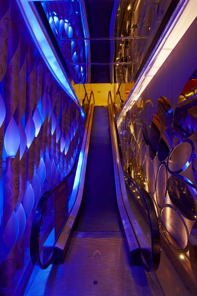 這里用到了意境,講究墻面留白的布置和瀑布的“氣勢(shì)”.更多的用透明材質(zhì)和不斷變幻的LED燈光來(lái)表現(xiàn)“藝術(shù)”,表現(xiàn)“氣韻”、 “境界”,這也是國(guó)畫(huà)的精髓所在。貫穿三個(gè)樓層的挑高梯廳,吊燈依然延續(xù)萬(wàn)花筒的設(shè)計(jì),隱喻水浪的藍(lán)白光影交錯(cuò),從里向外漫開(kāi)。